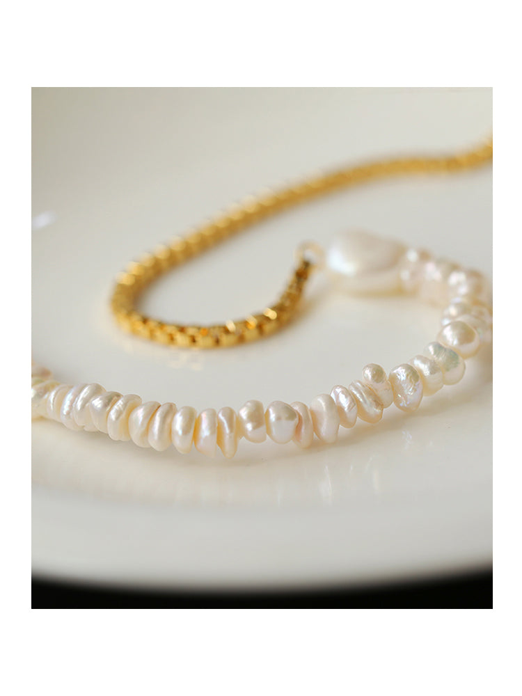Irregular small pearls are linked with metal chains, depicting liveliness and elegance, unassumingly blooming with brilliance.
